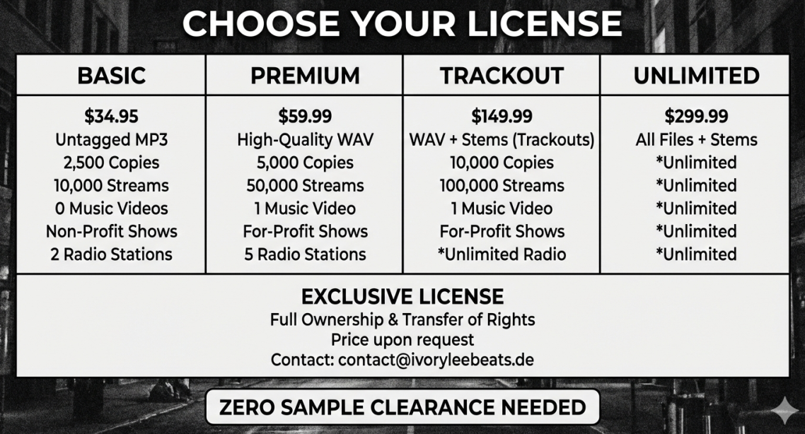All instrumentals remain the sole property of Ivory Lee Beats. By purchasing a license, you receive a limited right to use the beat.